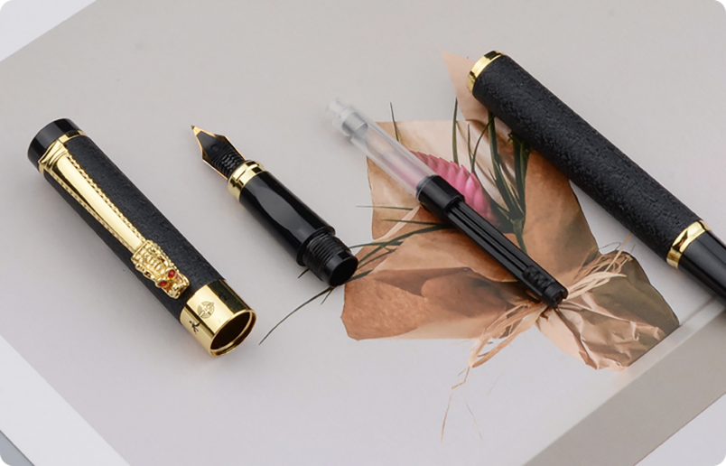 英雄·1949纪念版钢笔(左一、左三),使用独特的制笔技艺,将精心设计的梅花图案压印在笔尖上,呈现独特的质感。
